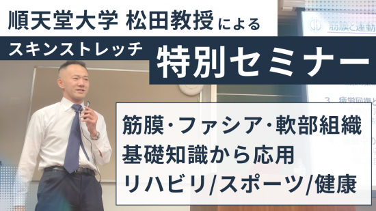 スキンストレッチ特別講習 順天堂大学教授による筋膜・ファシアを正しく理解する講義(順天堂大学松田教授/理学療法士)の1時間の特別セミナー動画です。